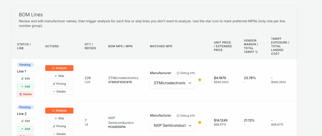 Upload full BOMs to instantly analyze line-by-line tariff exposure, HTS code mapping, and COO data. Export for internal reviews or quoting.